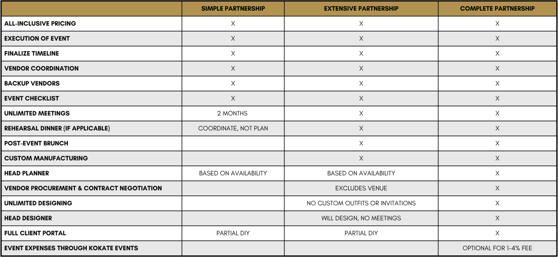 At Kokate Events, we curate only one Complete Partnership per day, with AJ, our Head Planner, personally guiding every moment. Extensive and Simple Partnerships receive AJ’s dedicated attention when available, which is confirmed during your Initial Consultation. Most Simple Partnerships are done by our seasoned coordinators who ensure it is effortless perfection.